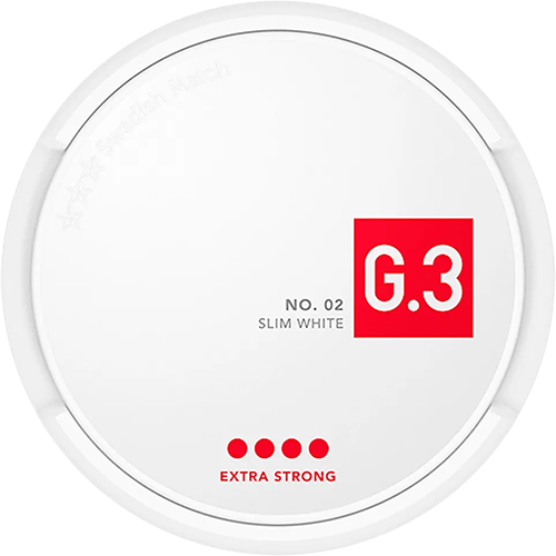 G.3 Slim White Extra Strong från varumärket G.3 är White Portion med stark styrka och med traditionell smak. G.3 Slim White Extra Strong kommer i slim format och varje dosa rymmer 24 portioner. G.3 är tillverkat av Swedish Match.