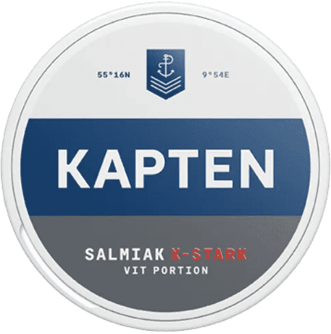 Kapten Vit Extra Stark Salmiak från AG Snus har en påtaglig smak av salmiak och extra hög nikotinhalt. Denna dosa innehåller 20 portioner och har en maritim design på utsidan. Eftersom det är ett vitt portionssnus, rinner det mindre och ger en bättre smakrelease. Med en nikotinhalt på 17,2 mg/g räknas den som en av de starkare varianterna. Kapten Vit Extra Stark Salmiak är ett vitt extra starkt portionssnus med smak av salmiak och traditionell tobak, med normalstora large-prillor.