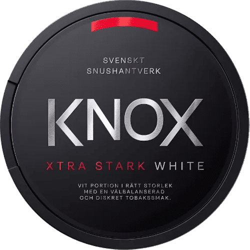 KNOX Xtra Stark White Portion har styrkan 4 Extra Stark, med en nikotinhalt på 1,9% eller 15 mg per portion. Varje prilla väger 0,8 gram, och varje dosa innehåller 24 prillor, vilket ger en total snusvikt på 19,2 gram per dosa. White portion-formatet ger låg rinnighet tack vare den torra utsidan, samtidigt som den fuktiga insidan säkerställer en behaglig smakfrigivning. Det större large-formatet på prillorna erbjuder en fylligare känsla under läppen.