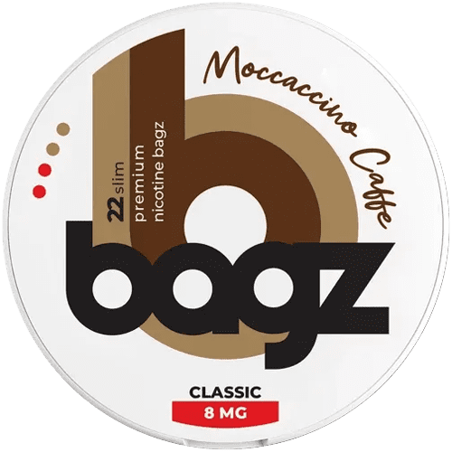 BAGZ Moccaccino Caffe är vitt snus med smak av kaffe och choklad, vilket ger en mjuk och aromatisk kombination. Förpackningen väger 14 gram och innehåller 22 portioner, där varje portion väger 0,625 gram. Nikotinstyrkan kan vara 8 mg eller 5 mg per portion beroende på variant.